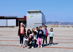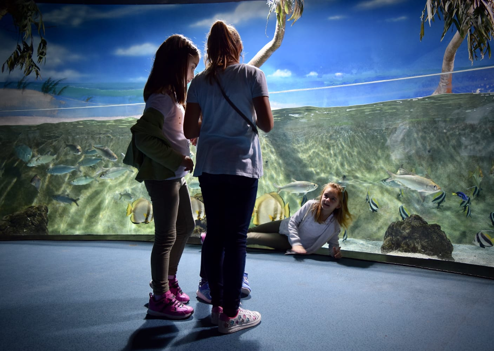 Nuestros hijos estaban encantados, no solo de corretear alrededor del precioso edificio, tan moderno y junto al mar, sino sobre todo, ¡porque sabían que es un centro interactivo! Nos dividimos en grupos para no asustar a los pobres peces con un aluvión de gente y comenzamos la visita. Fue fantástico ver a nuestros hijos observando la vida marina, los tiburones, las tortugas, las mantas raya… Incluso pudieron meterse en burbujas que se adentraban en el agua. Hasta hubo algunos valientes que posaron erizos de mar en sus manos. ¡Menos mal que no pincharon a nadie!