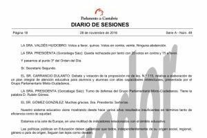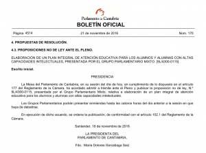 El 21 de noviembre de 2016 es admitida a trámite por el Parlamento de Cantabria la proposición no de Ley presentada el 15 de noviembre por el grupo Mixto. Dicha proposición fue debatida y votada en el Parlamento de Cantabria el 28 de noviembre de 2016, con resultado satisfactorio, aprobado por unanimidad.